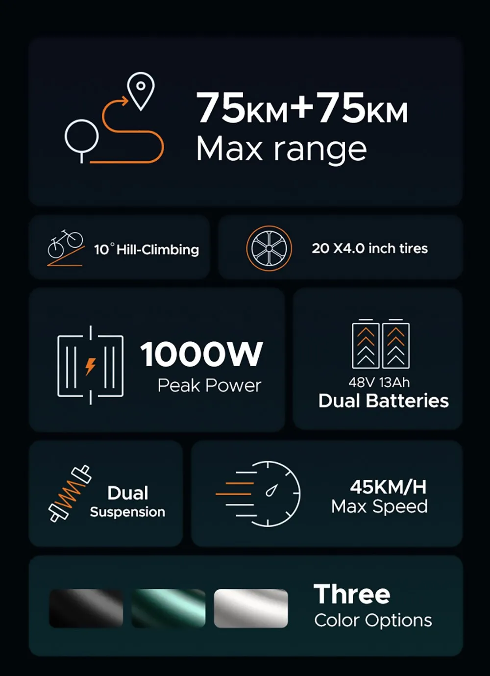 | U paketu dolazi | Baterije, ENGWE M20 Dual električni bicikl, Korisnički priručnik, Lokot sa šifrom, Nosač za pametni telefon, Prednje LED svjetlo, Prednji i zadnji blatobran, Punjač, Set alata, Stražnja nogara, Stražnje LED svjetlo, Torbica za pohranu |