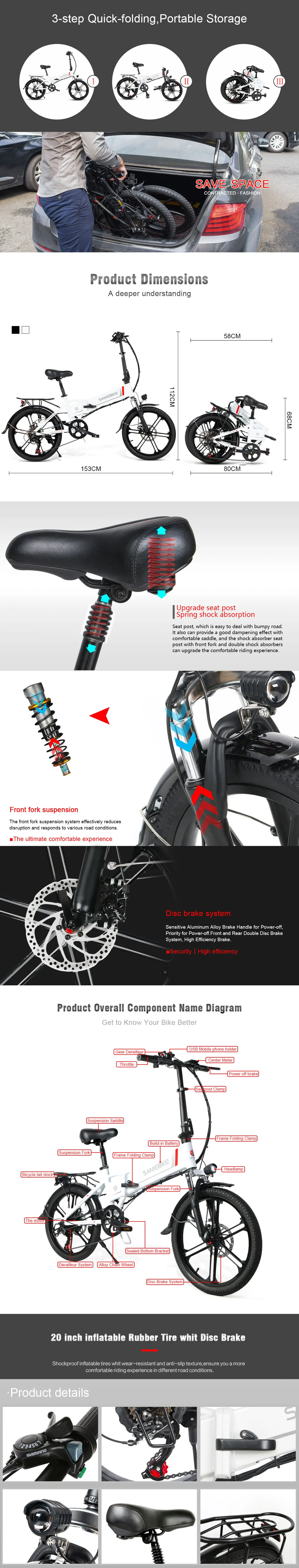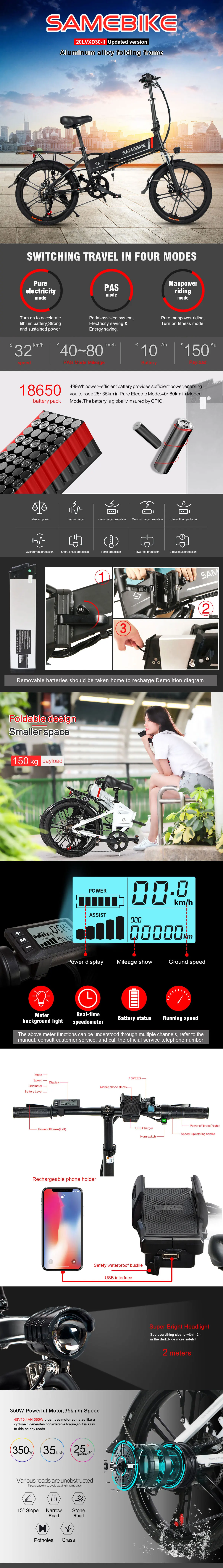 | U paketu dolazi | Baterija, Korisnički priručnik, Prednje LED svjetlo, Prednji i zadnji blatobran, Punjač, Samebike 20LVXD30-II električni bicikl, Set alata, Stražnja nogara, Stražnje reflektivno svjetlo, Stražnji nosač |
